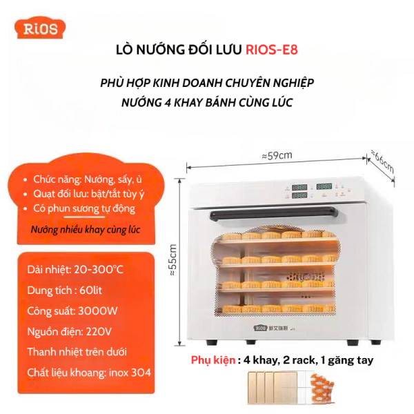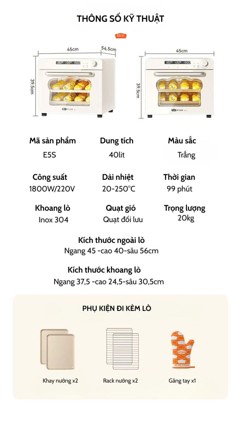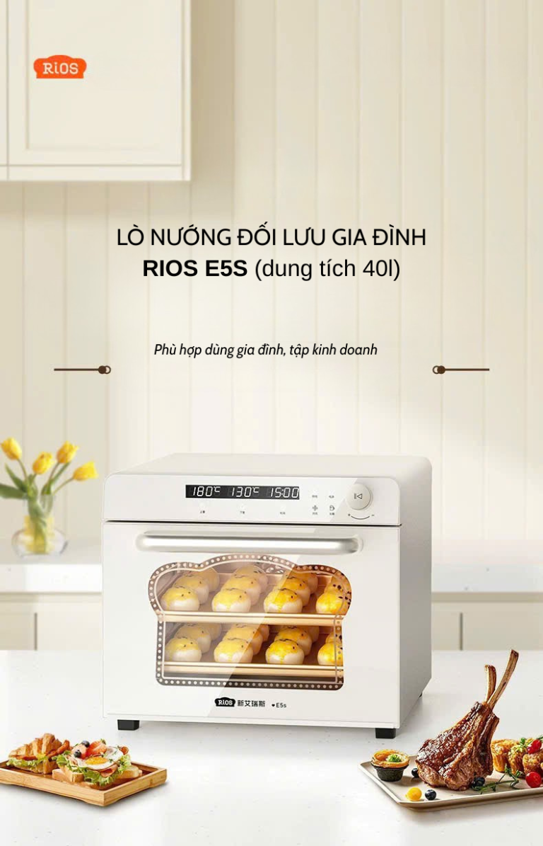 Rios E5S là mẫu lò nướng đối lưu đa năng mới nhất của Rios, sở hữu dung tích 40 lít rộng rãi, công nghệ nhiệt hiện đại và thiết kế sang trọng, là lựa chọn lý tưởng cho mọi gian bếp gia đình hoặc cửa hàng nhỏ. Với hiệu năng mạnh mẽ và độ bền cao, Rios E5S giúp bạn dễ dàng chế biến từ bánh ngọt, pizza đến các món quay nướng vàng giòn hoàn hảo.
