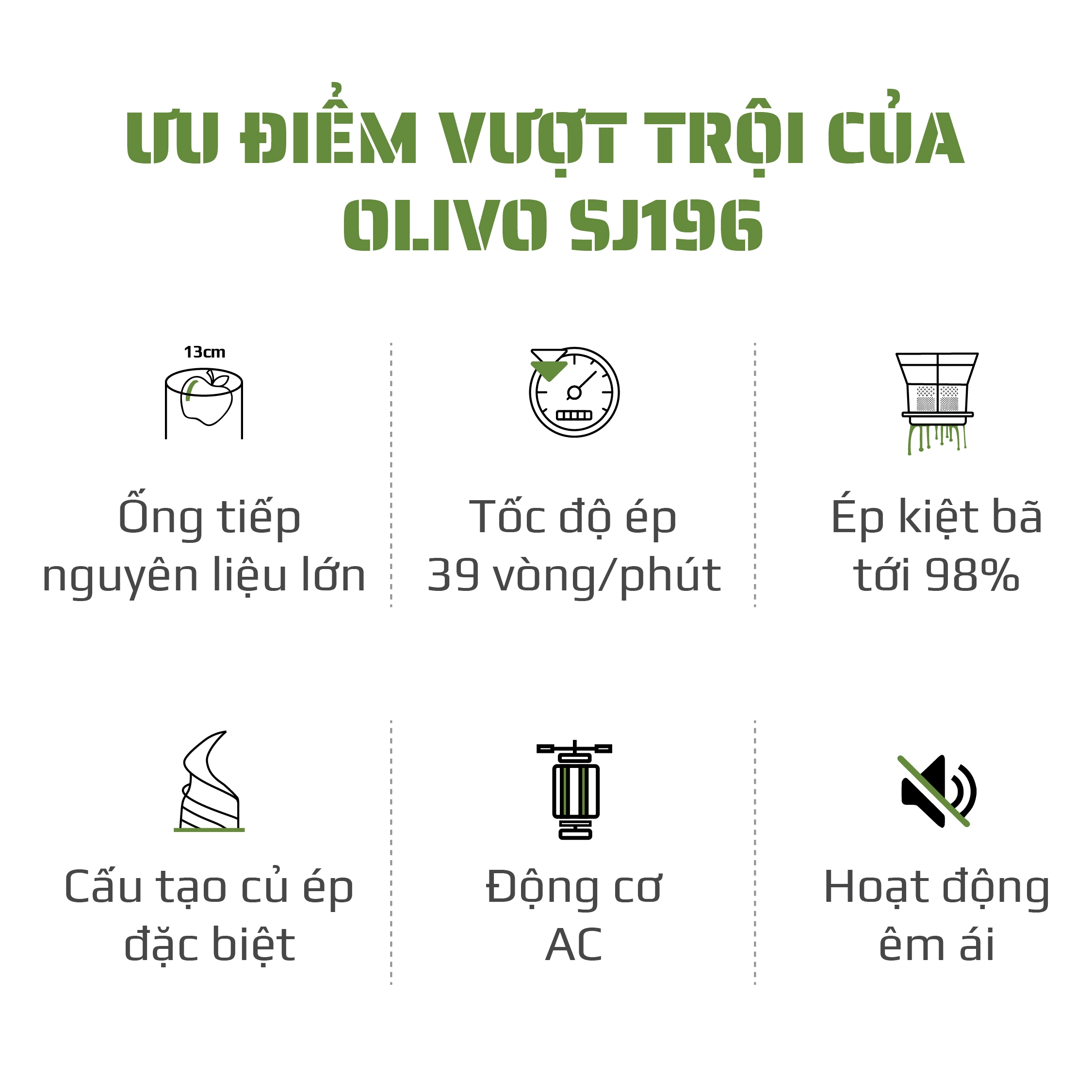Máy Ép Chậm OLIVO SJ196 Titanium là máy ép chậm cao cấp của thương hiệu OLIVO (Mỹ), thiết kế sang trọng màu Titanium, với công nghệ ép chậm tiên tiến giúp giữ trọn vitamin, enzyme & dưỡng chất tự nhiên trong trái cây – rau củ. Đây là lựa chọn hoàn hảo cho gia đình yêu đồ uống healthy, detox, uống mỗi ngày.