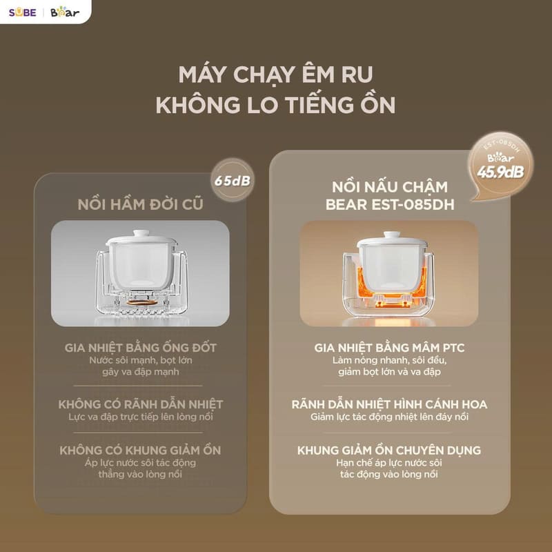 Nồi vận hành với độ ồn chỉ khoảng 45.9dB, êm hơn cả tiếng nói chuyện bình thường, nên có thể nấu ban đêm mà không làm ảnh hưởng giấc ngủ của bé.